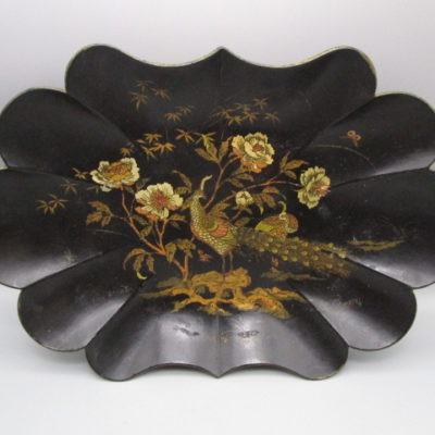 corbeille ancienne en papier mâché peint a décor de paon