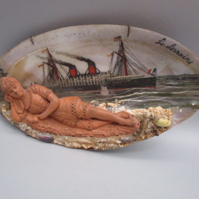 Souvenir de bord de mer ancien – paquebot la Lorraine – terre cuite et nacre
