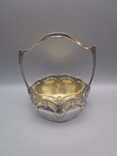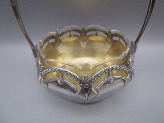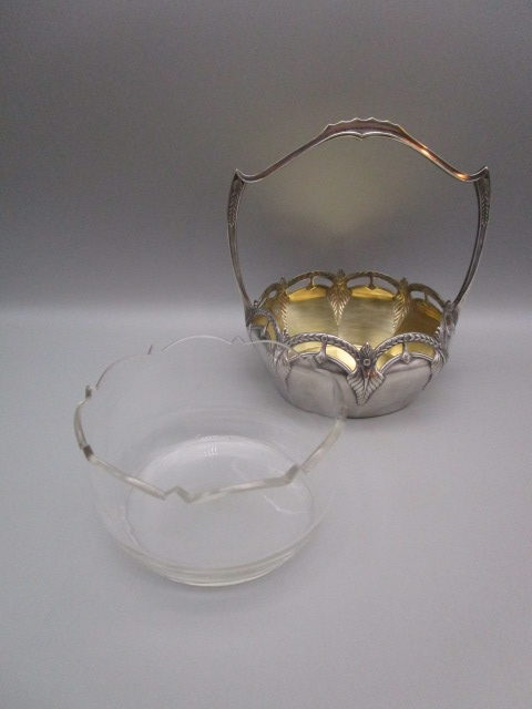 Coupelle/Panier de table art deco ancien en métal argenté et coupelle intérieure en cristal, en très bon état, diametre:12cm,hauteur sans l’anse:5.5cm, avec l’anse: 15cm