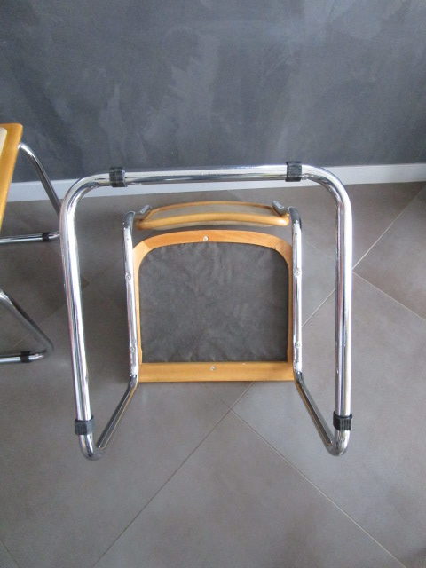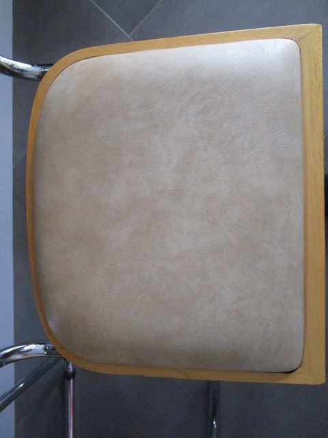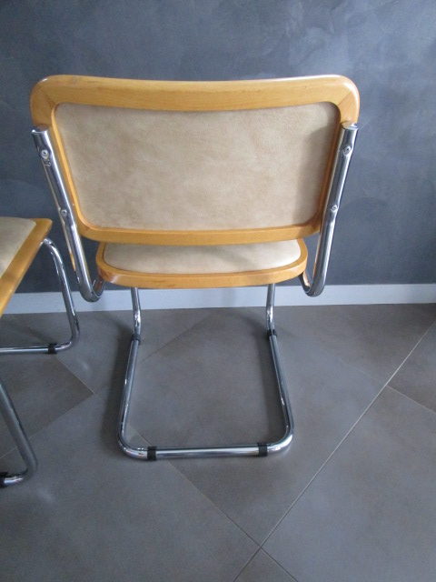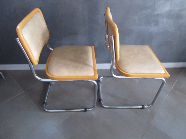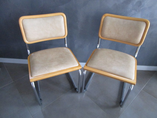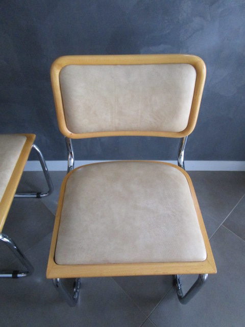 lot de deux chaises B32 Marcel Breuer(1) en bois clair et assises/dossiers capitonnés en skaï beige très confortable, en très bon état, le skaï est sans dommages, les parties bois avec quelques traces d’usage mineures (griffures, frottements) le partie acier est en très bel état, les tampons ont été changés
