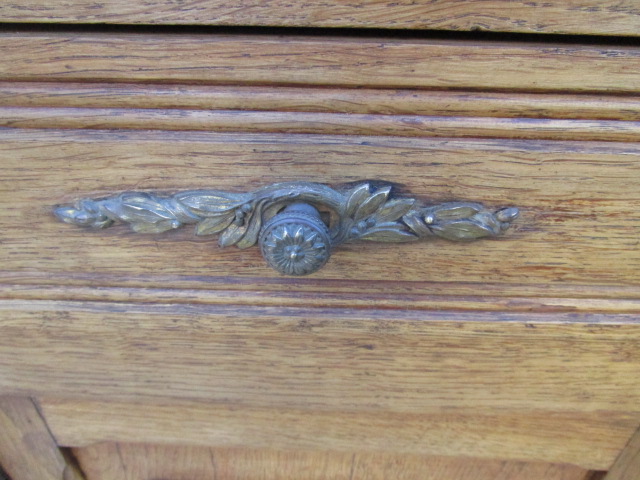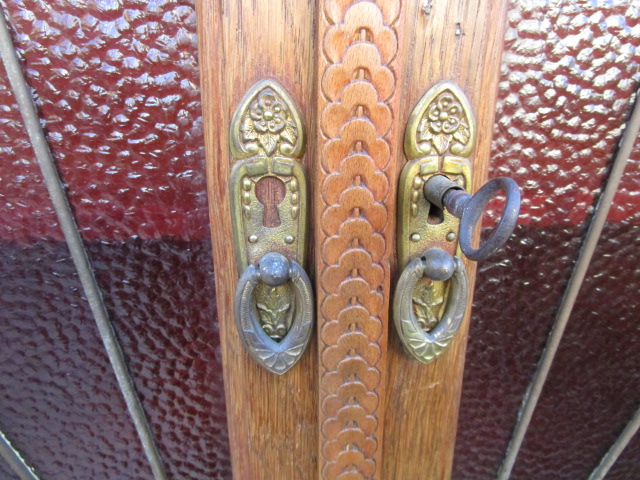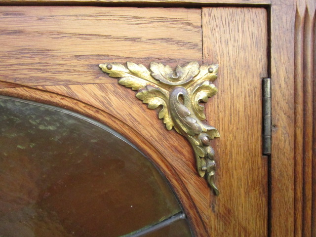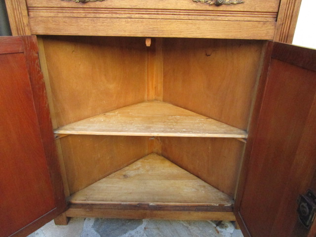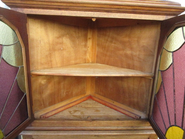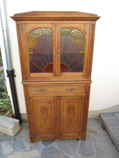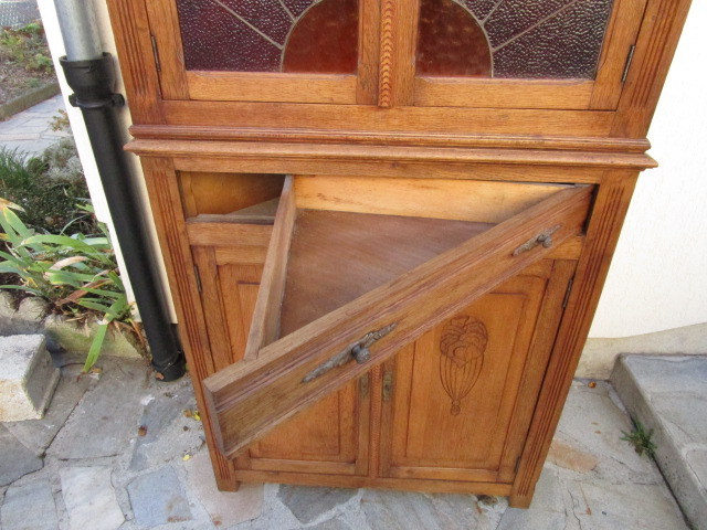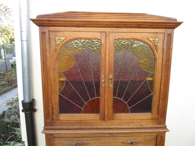 Meuble d’angle/encoignure art-déco, 2 corps, partie haute vitrée façon vitraux en superbe état, bronzes d’ornements, partie basse avec tiroir pivotant, poignées et ornement en bronze. Très bon état, il manque dans un angle un petit morceau de baguette de retour(voir photos) les deux serrures fonctionnent. Largeur: 88.5cm, profondeur: 49cm, hauteur: 177cm. Structure en chêne, étagères et intérieur en bois blanc. Les produits proposés dans notre boutique sont anciens, ils peuvent présentés des traces d’usure, d’usage ou rayures qui donnent au produit son caractère et son authenticité, ils sont présentés au mieux dans la description, à travers photos et textes, merci de bien les regarder. Les livraisons assurées par nos soins se feront uniquement le samedi matin pour Paris et la petite couronne.