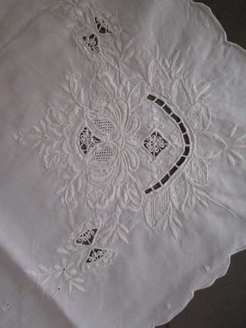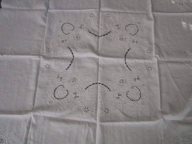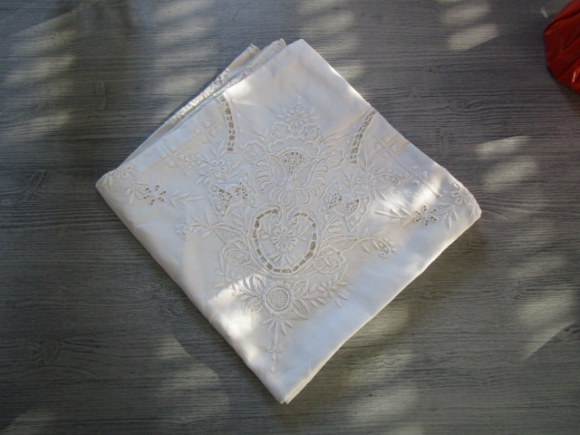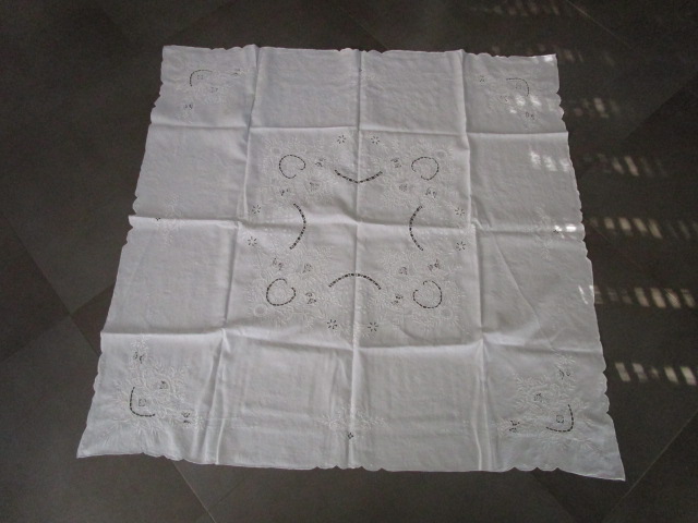 Nappe a thé ancienne brodée en très bon état, linge lavé et repassé, il peut néanmoins subsister des petites taches qui auraient échappées a notre lavage., dimensions:120 x120cm