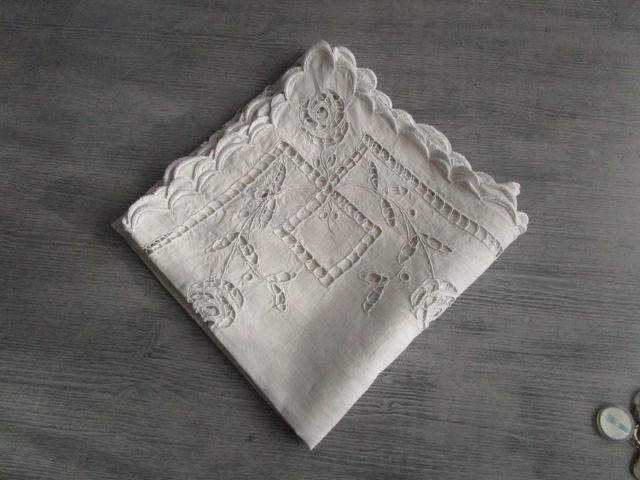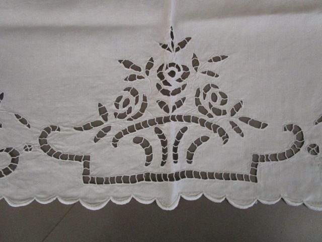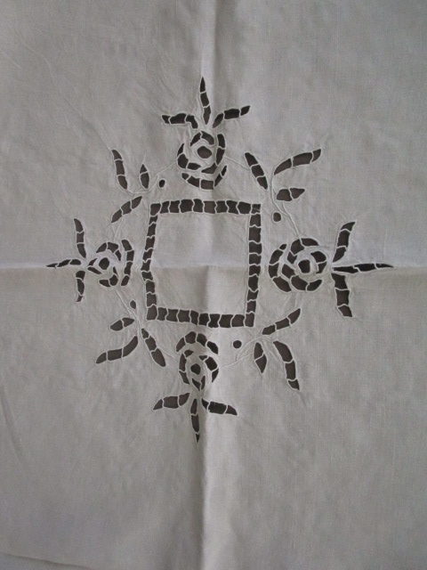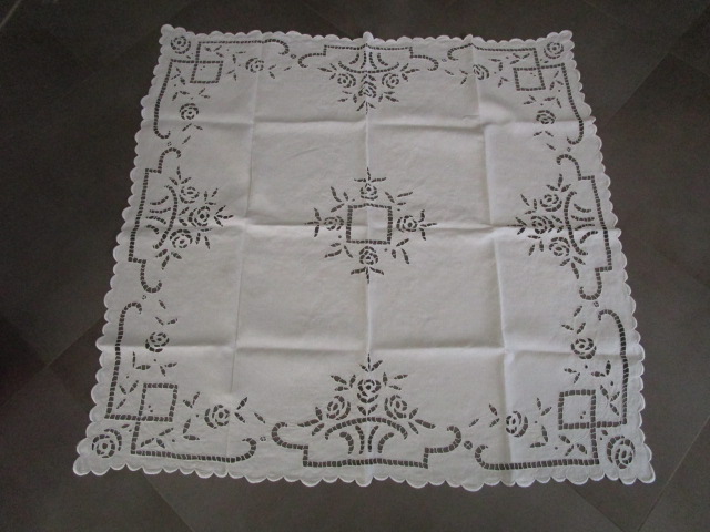 Nappe a thé ancienne brodée en très bon état, linge lavé et repassé, il peut néanmoins subsister des petites taches qui auraient échappées a notre lavage., dimensions:125 x125cm