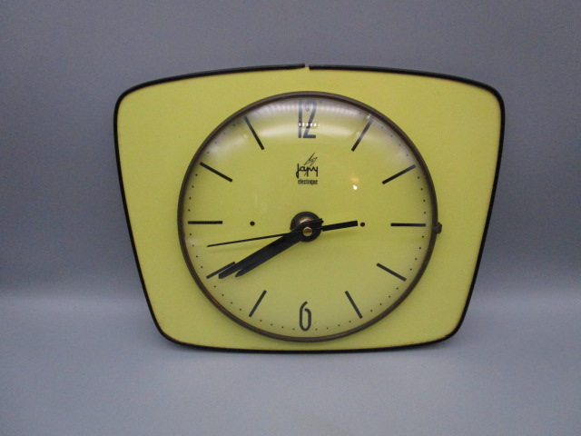Pendule vintage formica jaune Japy, en très bon état, mécanisme neuf, silencieux, largeur: 24.5cm, hauteur:20cm