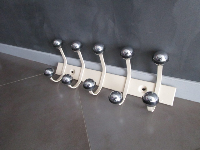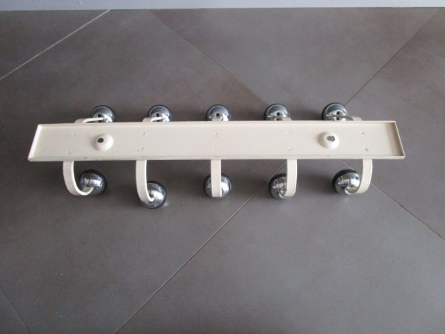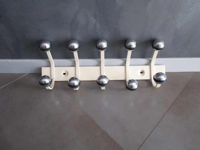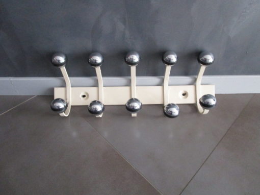 Porte-manteau vintage en métal et boules chromées, en bon état, traces d’usage et trace de peinture sur les rebords