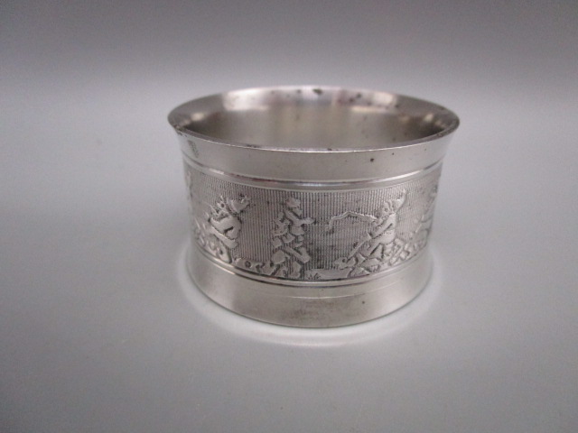 Rond de serviette ancien en métal argenté – décor de lutins, en bon état