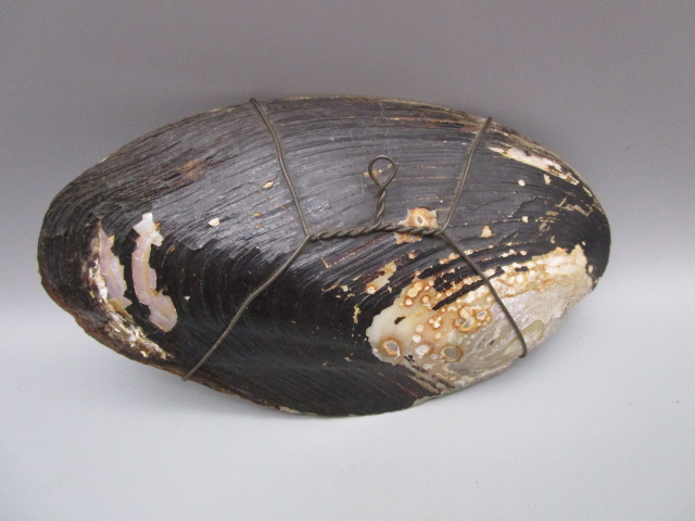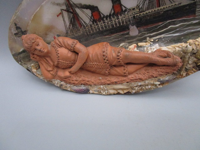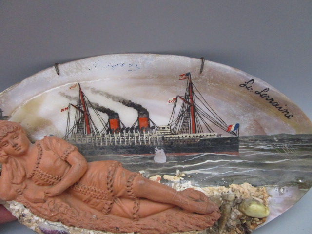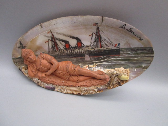 Souvenir de bord de mer ancien sur une base de grosse moule avec une peinture du paquebot » la Lorraine » et baigneuse en terre cuite sur lit de coquillages