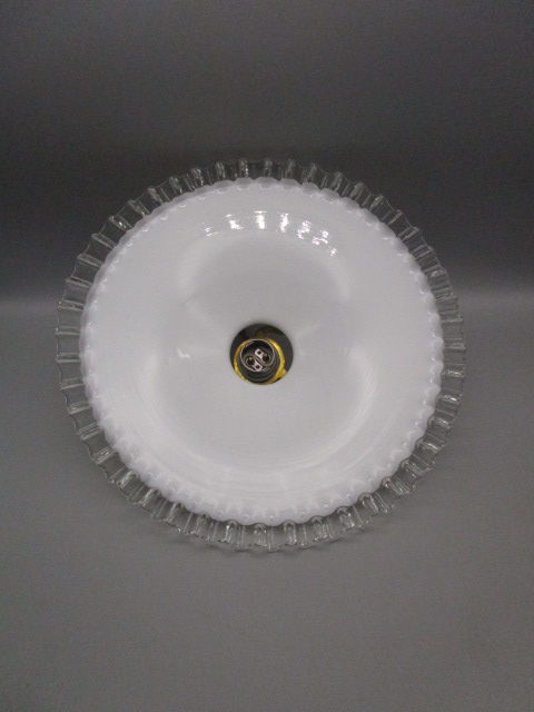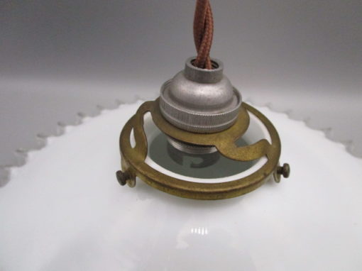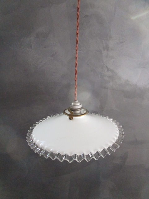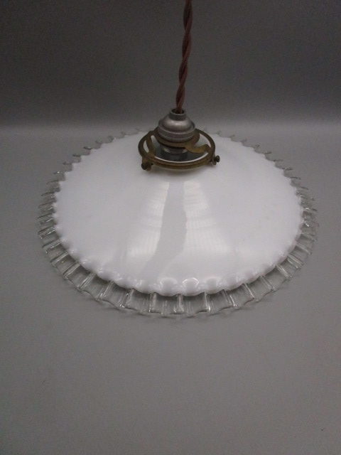 Suspension ancienne en opaline blanche et rebord juponné transparent, en très bon état, électricité refaite, fournie sans ampoule, fil de 45cm. Diamètre: 25.5cm.